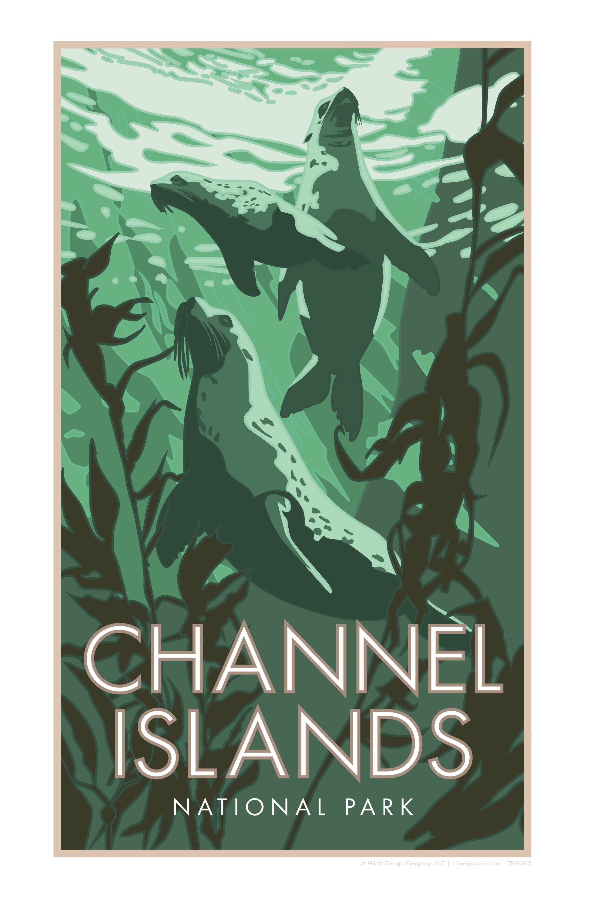 Our original design of Channel Islands National Park captures the pristine waters and abundant marine life in the area's natural habitat. Located off the coast of southern California, the island chain of Santa Rosa, San Miguel, and Santa Barbara offers a sanctuary for diverse wildlife including seals and sea lions in one of the largest underwater national marine sanctuaries. Commemorate your experience with our unique TravelPosters.com design today.