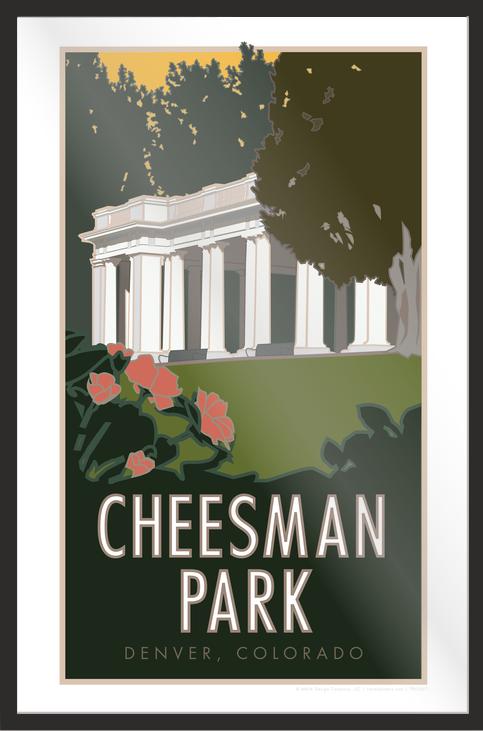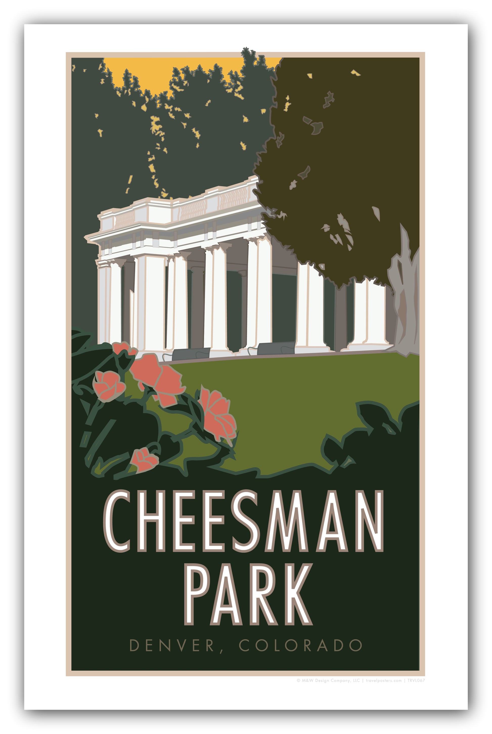 The Cheesman Park Pavilion and surrounding trees are the featured focus of our poster art print. Our design captures the neoclassical style of the building and the urban Denver, Colorado park which is renowned for its trees and flower gardens. This 80-acre park is located in the Cheesman Park neighborhood and includes the Denver Botanic Gardens.