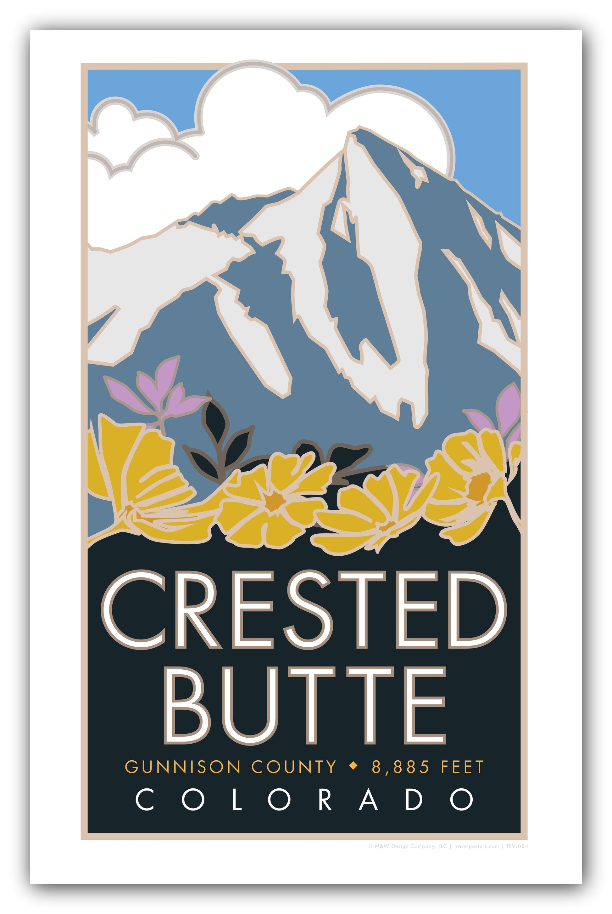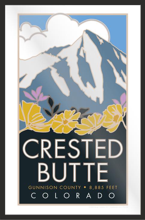 This poster design captures the beauty of summer in Crested Butte. Known as the Wildflower Capitol of Colorado, beauty abounds in the Rocky Mountains that surround the town. Mountain biking the 401 Road, hiking the Lupine Trail, or enjoying a sip of coffee, you'll fill your days with fresh air. In the fall, explore Kebler Pass for quaking aspens or hike the traverse through Maroon Bells Wilderness from Maroon Lake to Crested Butte.