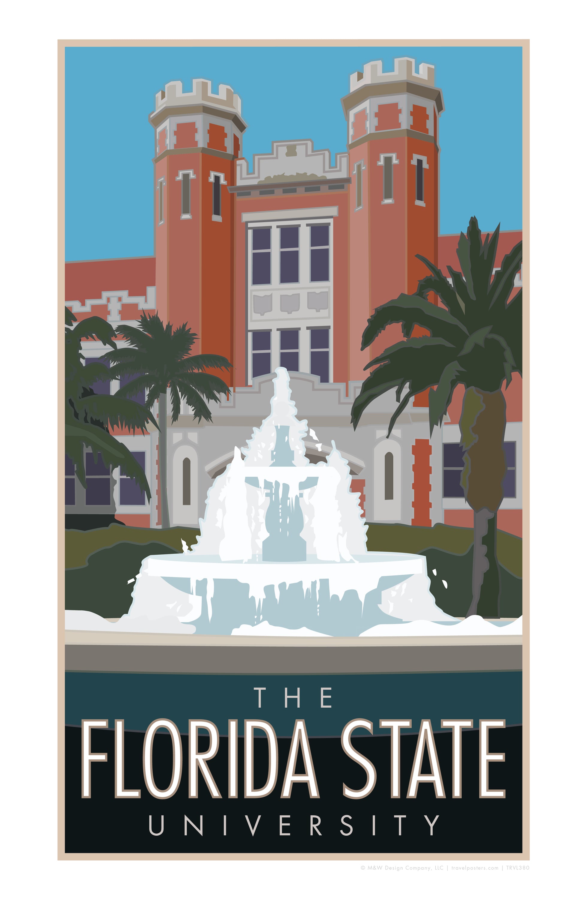 This design captures the timeless beauty of Westcott Fountain with bold lines and classic detail, highlighting the enduring spirit of Florida State. It celebrates a landmark that represents both the history and future of the university, evoking the pride and connection shared by all who call FSU home.