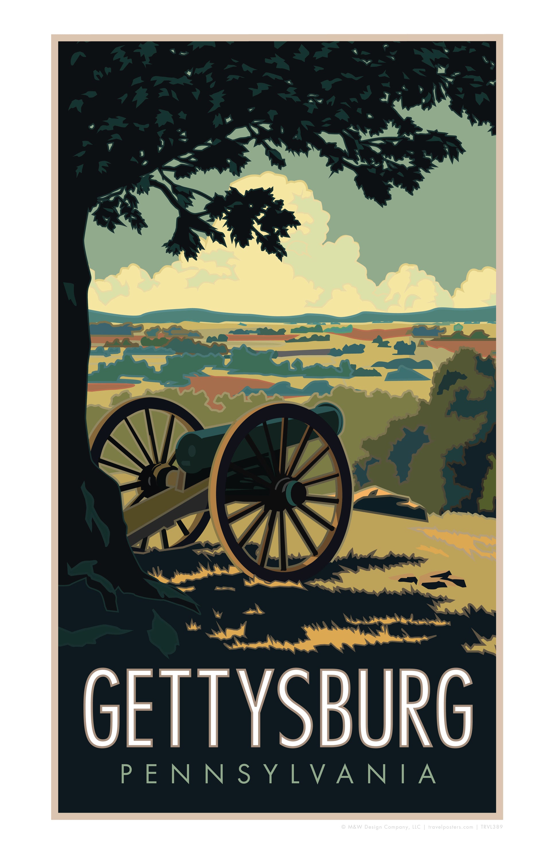 This design features a cannon in the foreground, overlooking the historic battlefield where so many fought and fell. The artwork evokes both the solemnity and the enduring legacy of Gettysburg, celebrating a destination where history is not only remembered but felt across the quiet hills and fields.