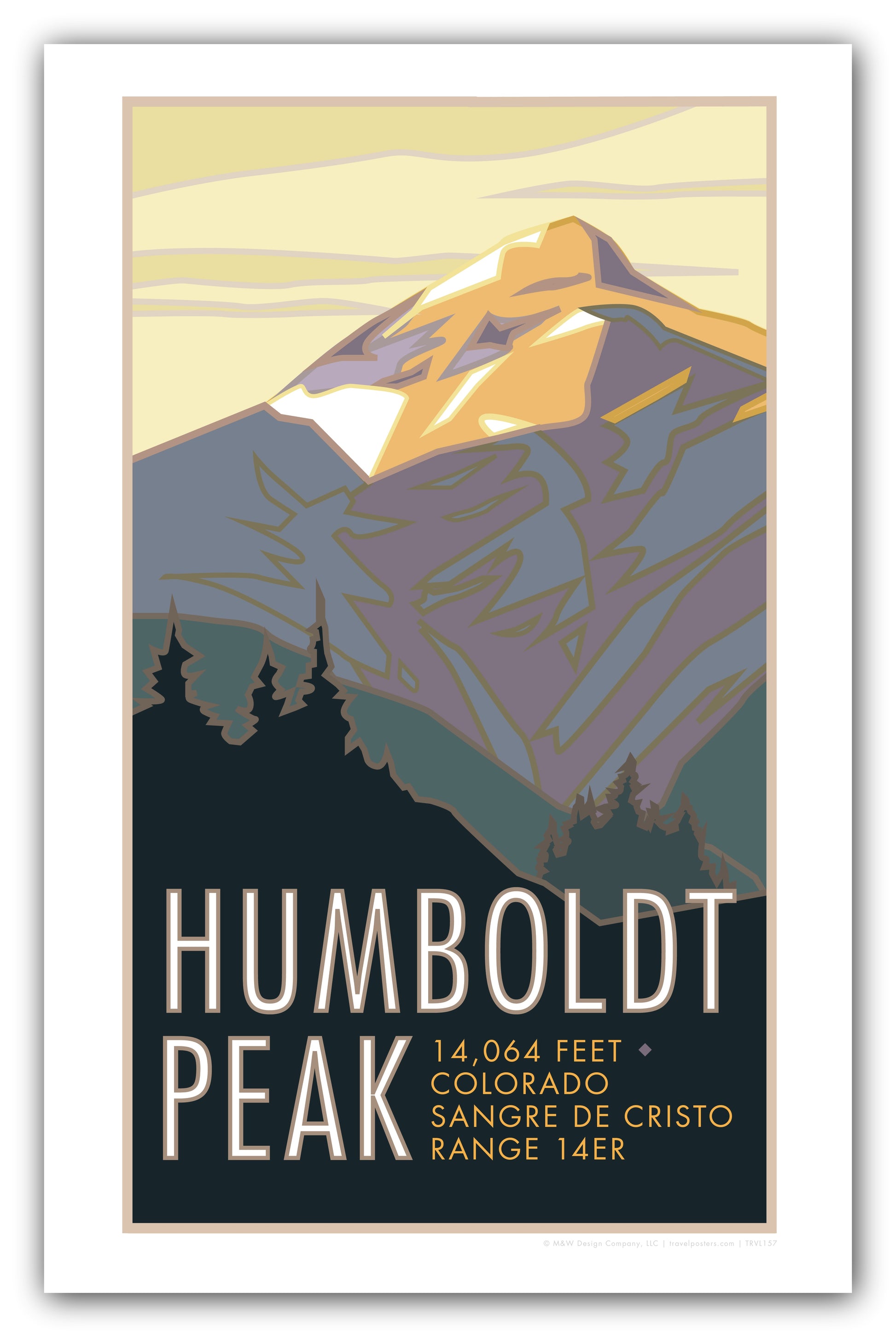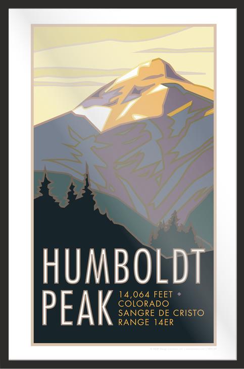 Our poster art print of Humboldt Peak is part of our 14er Collection Series. The poster has a 'vintage' feel in color and design and celebrates your climb up this peak in the Sangre de Cristo Range of Colorado's Rocky Mountains.