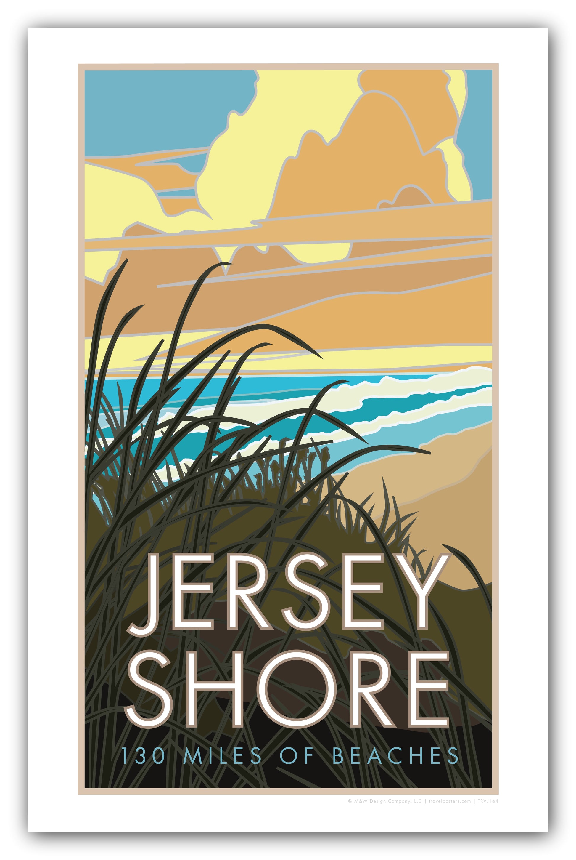 The beautiful 130+ miles of beaches along the Jersey Shore lure millions of visitors every summer, calling them to surf, swim, and enjoy the breath-taking views. Our original design captures the majesty of these views of New Jersey's "Jersey Shore" on a clear, blue summer day.