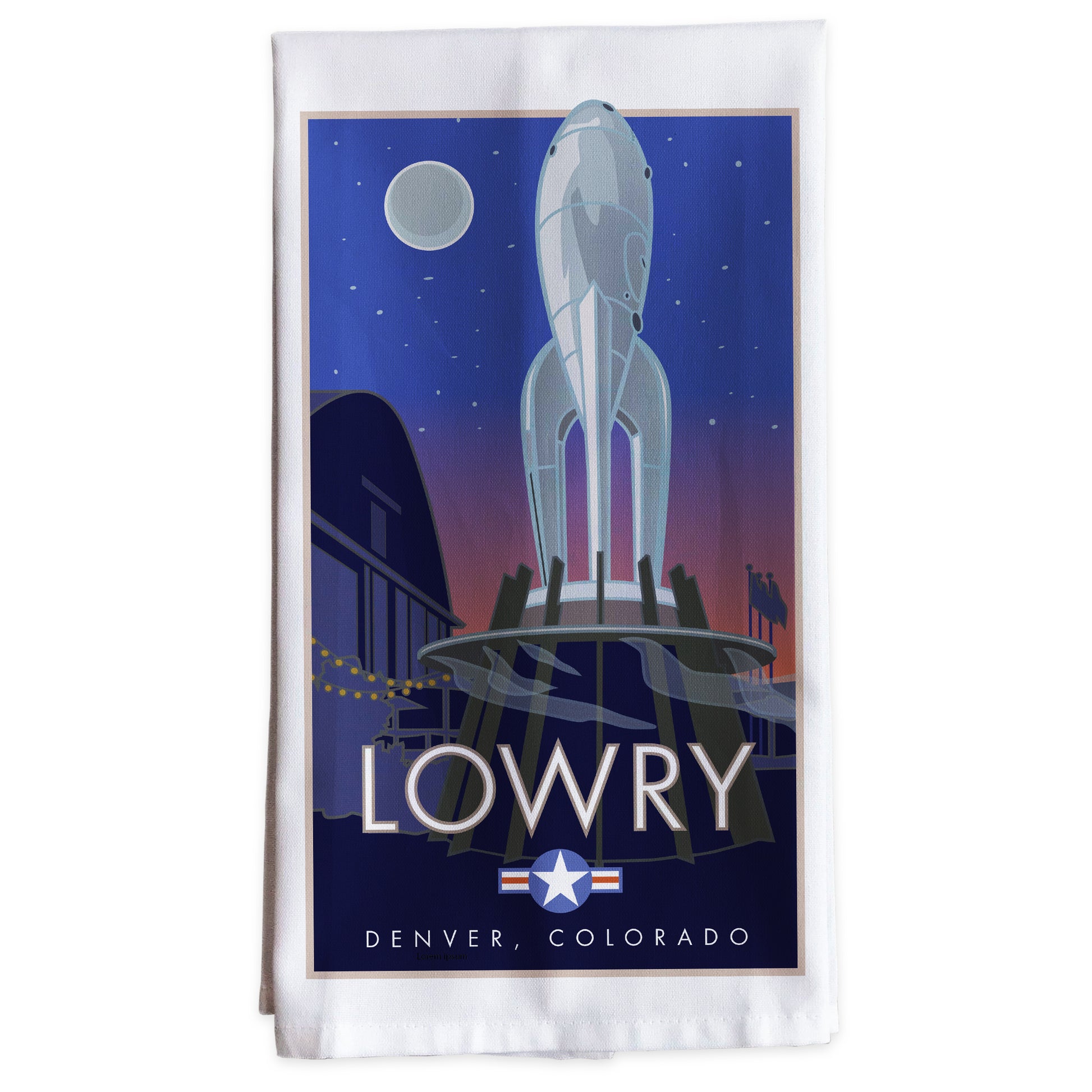 Our Tea Towel of Lowry captures the old and new of this popular east Denver neighborhood. This former Army Air Force Base that borders Denver and Aurora, Colorado, has been transformed into a bustling urban development with condos, restaurants, and open space. Hangars that once held B-52 bombers now contain Wings over the Rockies Air and Space Museum. The Officer’s Club and housing and the old barracks of the base have been updated to preserve the historic elements of the area.