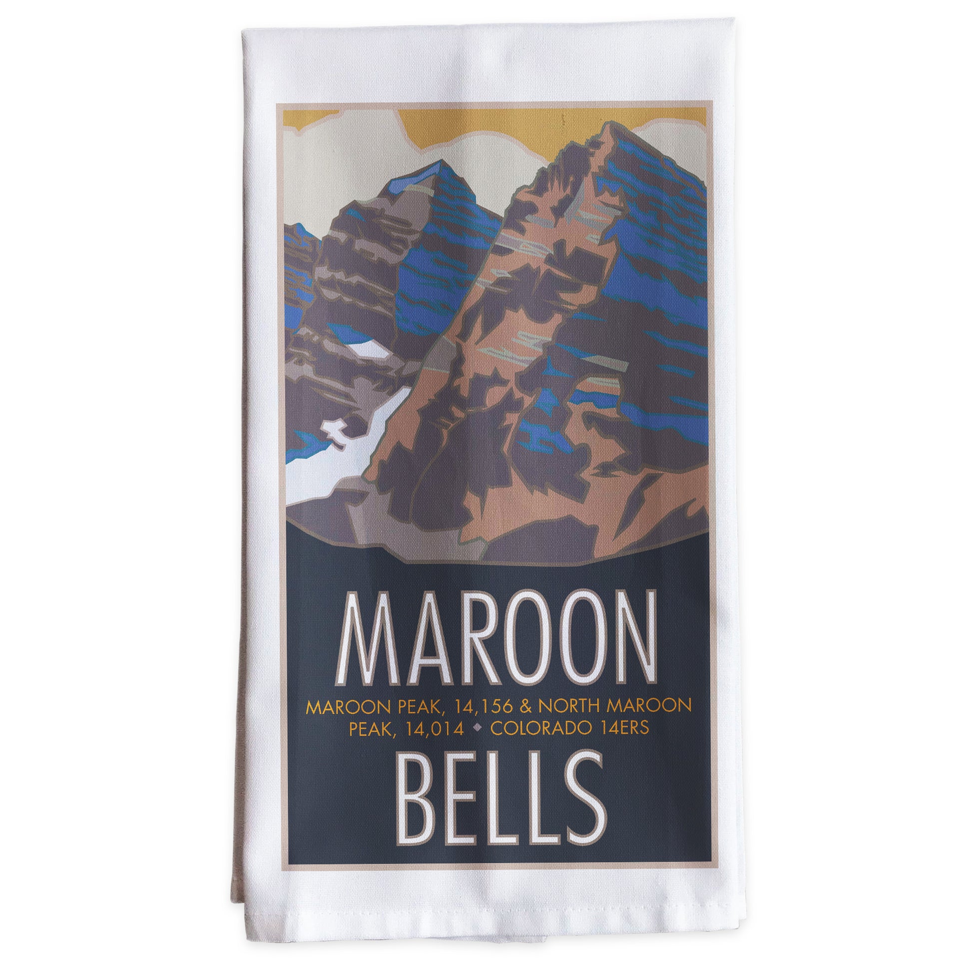 Our Tea Towel of Maroon Bells is a popular design in our 14er Collection Series. The magnet captures the angled sedimentary layers of Maroon and North Maroon Peaks with a close-up view above Maroon Lake along the West Maroon Creek Trail to Crater Lake. Enjoy alpine meadows, aspen forests and rocky slopes along this hike, and celebrate your climb up this peak in the Elk Range of Colorado’s Rocky Mountains near Marble, Snowmass, and Aspen.