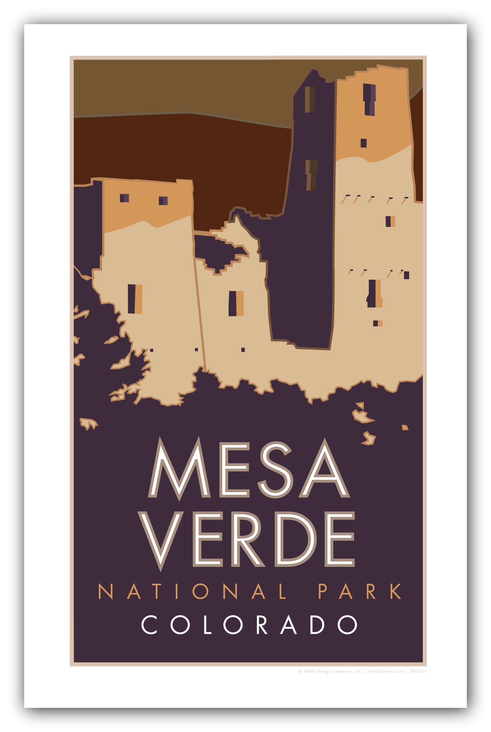 Nestled in the hills of Colorado's southwest between Durango and Cortez, Mesa Verde National Park preserves the structural foundations of an ancient civilization of the Ancestral People of southwest United States.Our poster art design ushers in a daytime view of Spruce Tree House where native people of area once lived.
