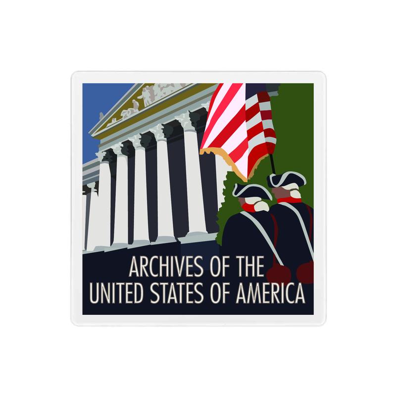 This design highlights the stately architecture of the National Archives while featuring colonial soldiers in the foreground, a symbolic nod to the patriots who fought to secure the freedoms enshrined within its walls. The pairing of historic figures with the building’s majestic façade underscores the continuity of America’s story, celebrating a destination that honors both the nation’s origins and its enduring legacy.