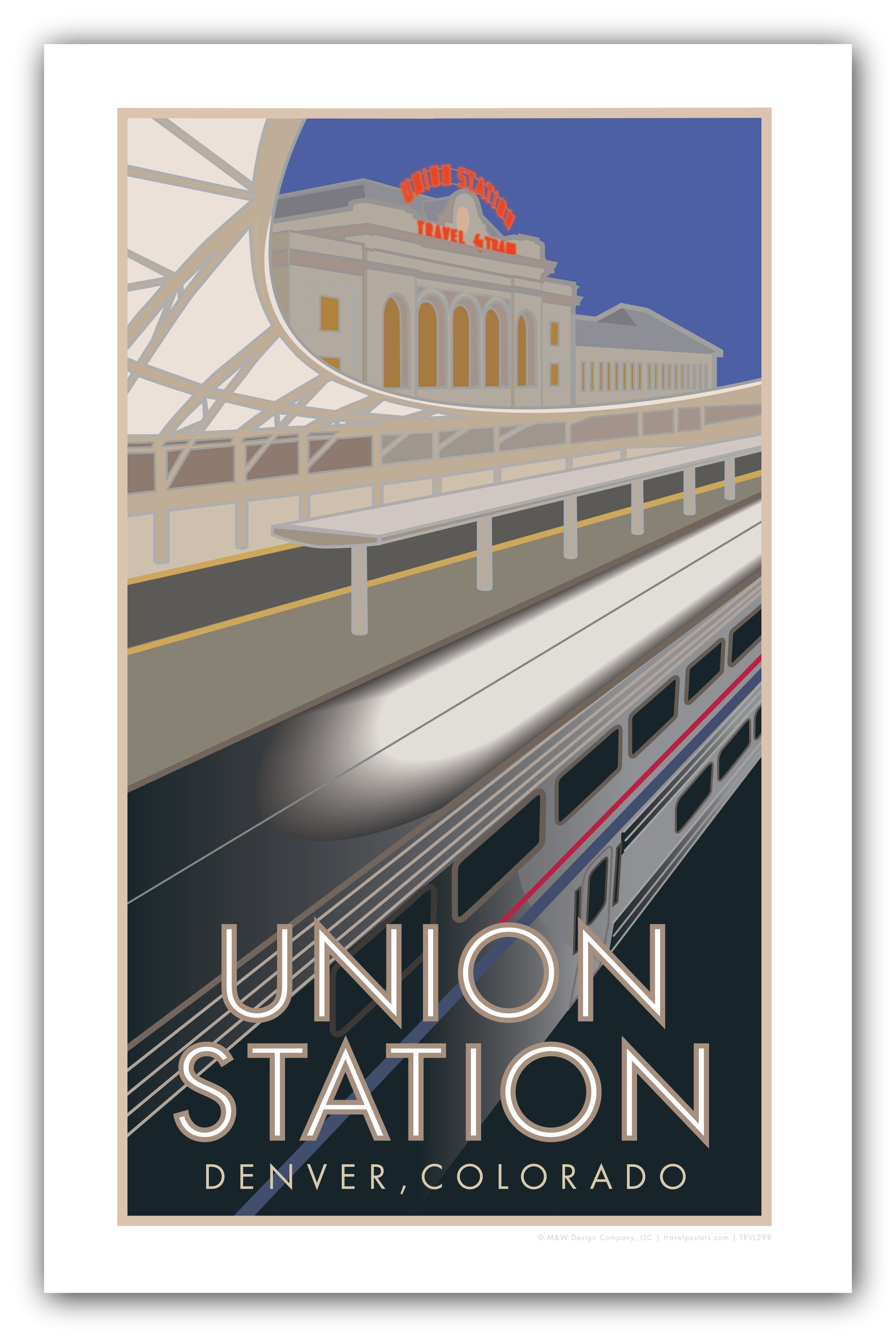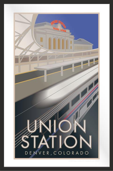 The'Travel by Train' lights and the California Zephyr are captured in the back platform view of Denver Union Station. Our original poster design is one of four in a series featuring views of the historic LODO area of this downtown Denver, Colorado transit hub. Mirroring the Denver International Airport roof design, the terminus is sheltered by a modern canopy, welcoming travelers from near and far. Access to both Light Rail and Amtrak trains is found here, bringing life and energy to the downtown entertainment, sports, and travel district.