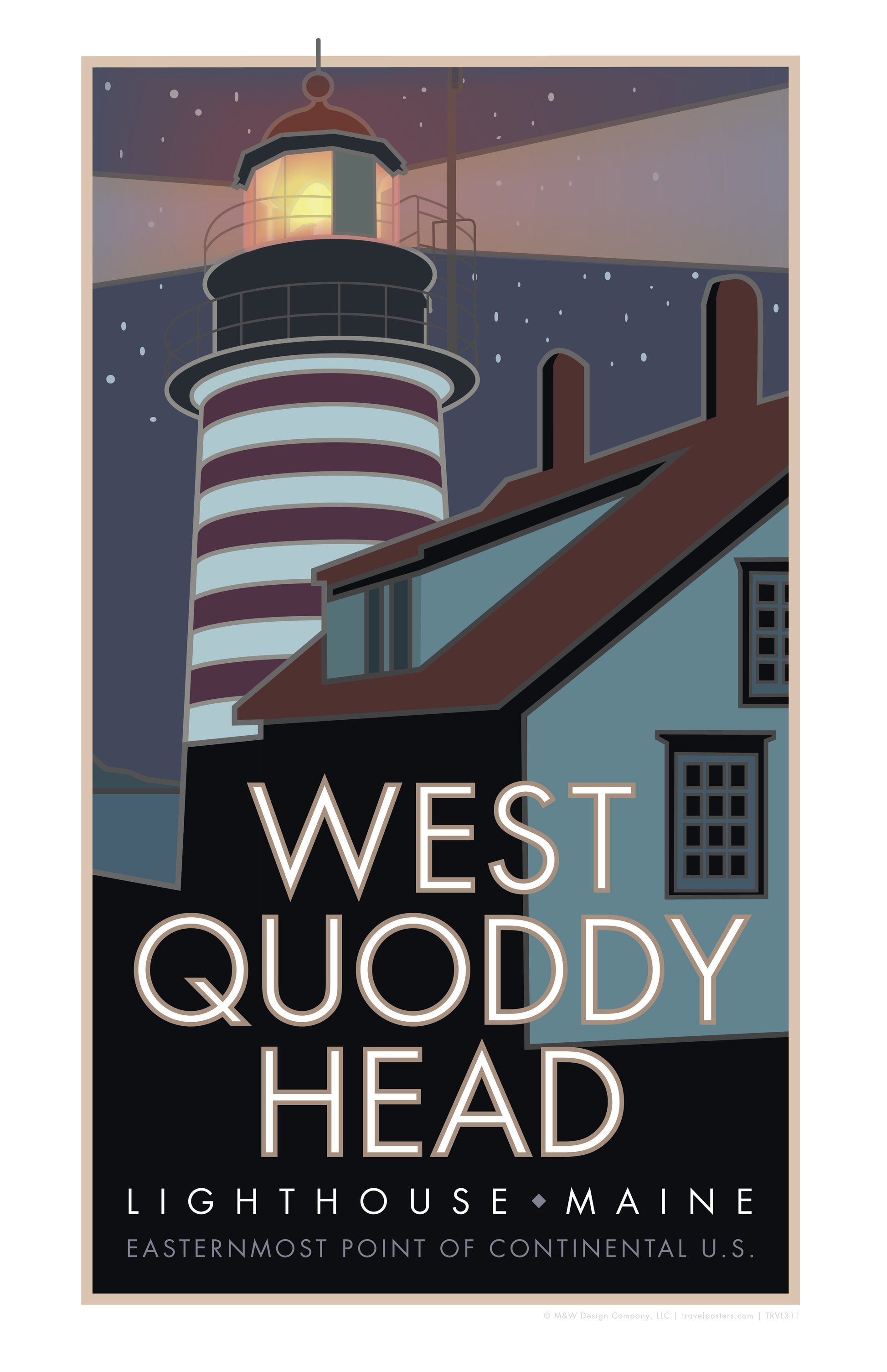Part of our Head/Lighthouse Collection, West Quoddy stands out tall and bright on the easternmost point of the continental U.S. Its Visitor's Center and Museum welcome travelers from near and far. Our unique design captures a night view of the 'candy striped' red and white tower which has boldly warned oncoming ships of the impending rocky cliffs near Lubec, Maine since the time of Thomas Jefferson. For lighthouse buffs, this is a uniquely New England site to be seen and remembered.
