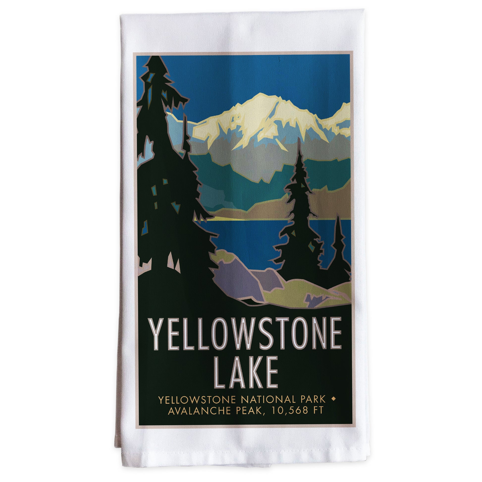 A result of volcanic and glacial forces, Yellowstone Lake is the largest, high-elevation lake in North America. Located in Yellowstone National Park in northwestern Wyoming, this hub of camping, fishing, hiking, biking and site-seeking attractions, is popular. Our Tea Towel design captures the solitude of peaceful waters in vintage-art styles and modern colors.